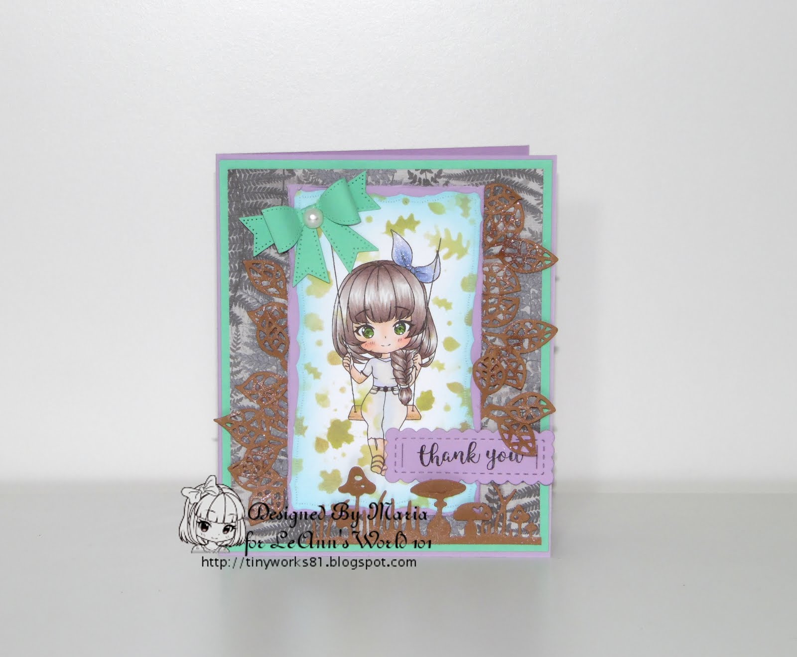 ho utilizzato varie fustelle per le decorazioni. Ho realizzato lo sfondo con uno stencil fatto con la silhouette cameo , gli oxide usati sono tumbled glass, frayed burlap, peeled paint. Sulle foglie e sui funghi ho applicato l'acqua scintillante di tommyart. Il sentiment è un set di pennyblack timbrato con il memento.